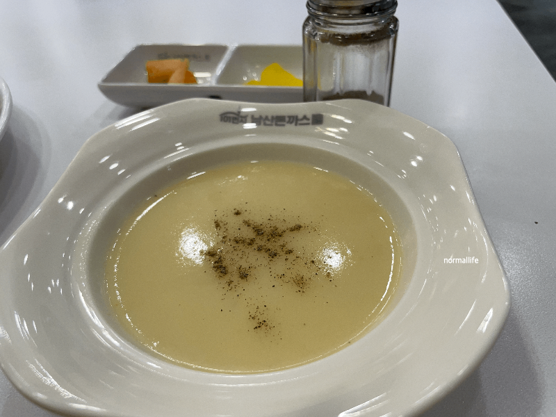 이마트 세종점 쇼핑 후 든든하게 식사하기 좋은 왕돈까스 맛집 101번지 남산돈까스를 방문해 보았다. 남산까지 가지 않아도 세종에서 남산의 정취와 옛 추억의 맛을 그대로 느낄 수 있는 곳이다. 돈까스는 남녀노소 불문하고 언제나 환영받는 메뉴이고 아이가 있는 집이라면 외식 메뉴 1순위이다. 후추를 톡톡 뿌려 먹는 크림수프는 어릴 적 경양식 집에서 먹던 감성을 그대로 소환한다. 바삭하게 튀겨져 나온 왕돈가스 위에 달콤 짭짤한 전형적인 옛날 돈까스 소스가 올려져 나온다. 소스가 부어져 나오는데도 튀김옷의 바삭함이 살아있어 마지막까지 바삭하게 맛볼 수 있다. 돈까스 접시 한쪽에 큼직한 오이고추와 쌈장이 함께 제공되어 돈까스의 느끼함을 싹 잡아준다.
