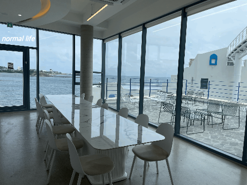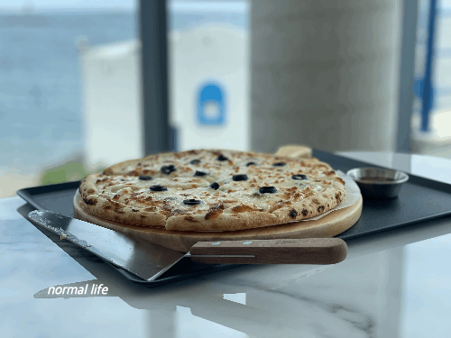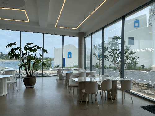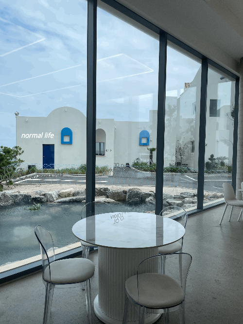 바다와 햇살이 가득 들어오는 시원한 통창으로 산토리니 감성을 그대로 느낄 수 있는 오이아카페이다. 일층과 이층의 넓은 공간과 통창이 주는 개방감과 확트인 시야가 동해를 눈으로 즐기기에 충분했다. 오이아카페 통창으로 시원한 오션뷰를 감상할 수 있고 지중해의 그리스 어느 작은 마을에 온듯한 뷰를 감상할 수 있다. 어느자리에 앉든 일상에서 벗어나 창밖을 바라보며 여유를 부리면 될 듯 하다.