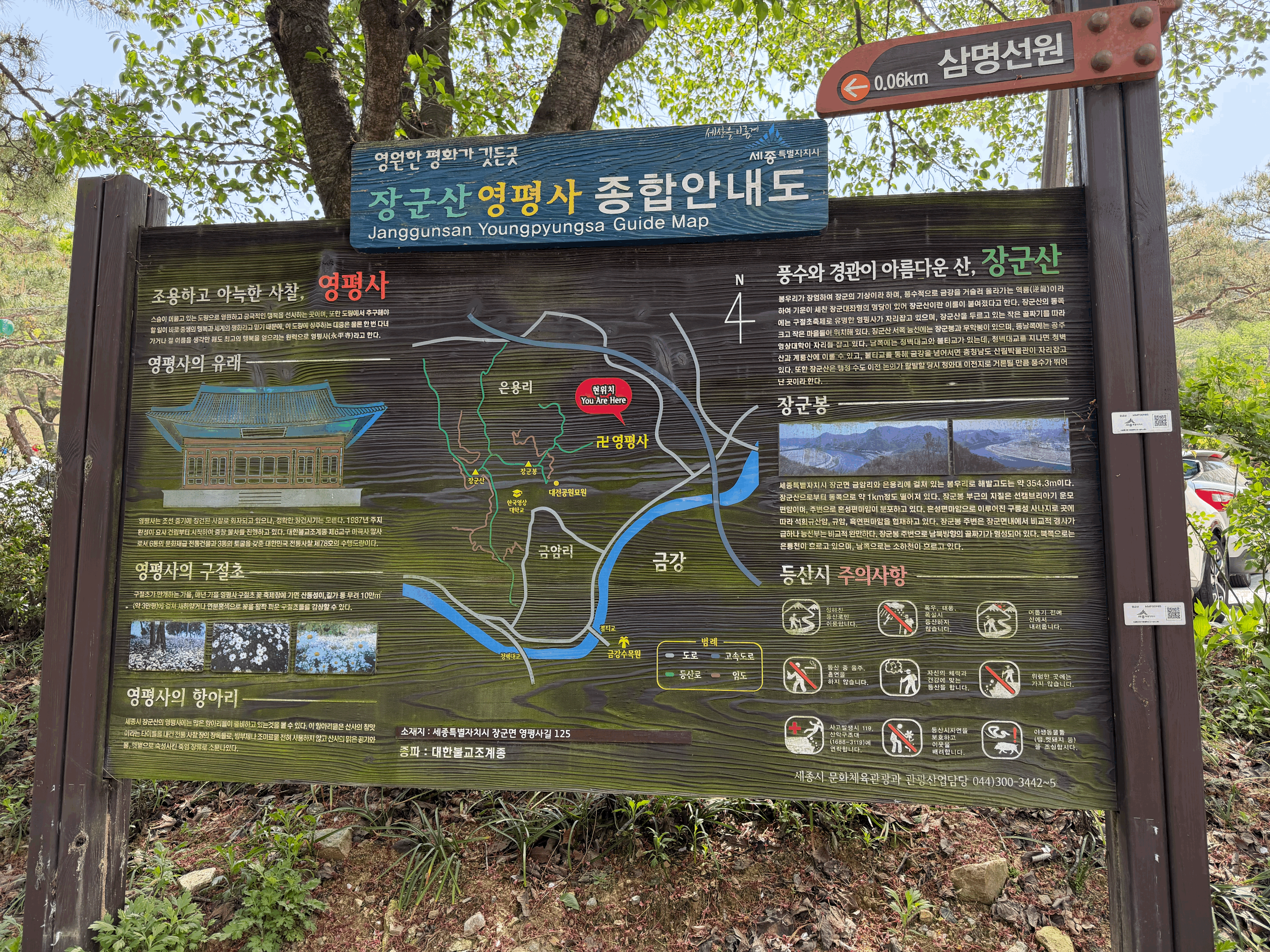 영평사는 자연의 아름다움이 어우러진 사찰이다.세종시 도심에서 차로 약 15~20분 정도 거리로 접근성이 좋다. 다만 봄, 가을 축제 기간에는 매우 붐비니 가급적평일에 방문하는 것이 여유롭다. 산행을 좋아하시는 분들이라면 안내도에 표시된장군봉 등산 코스를 따라 가볍게 트레킹을 즐겨보시는 것도 영평사를 즐기는 또 하나의 좋은 방법이 될 것 같다.