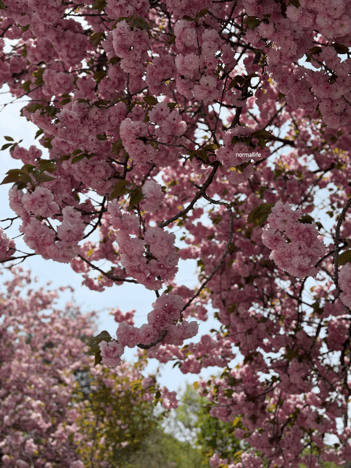 방문일 2026년 4월 23일 기준, 세종 영평사의겹벚꽃은 만개하여 절정을 이루고 있었다. 꽃잎이 여러 겹으로 겹쳐 있어 마치 작은 장미나 카네이션처럼 탐스러운 것이 특징이다. 겹벚꽃이 100% 만개하여 그야말로 '꽃폭포'가 쏟아지는 장관을 연출하고 있다. 겹법꽃이 가장 예쁜 시기는 4월 말이니 놓치지 말고 꼭 다녀와야 한다.
