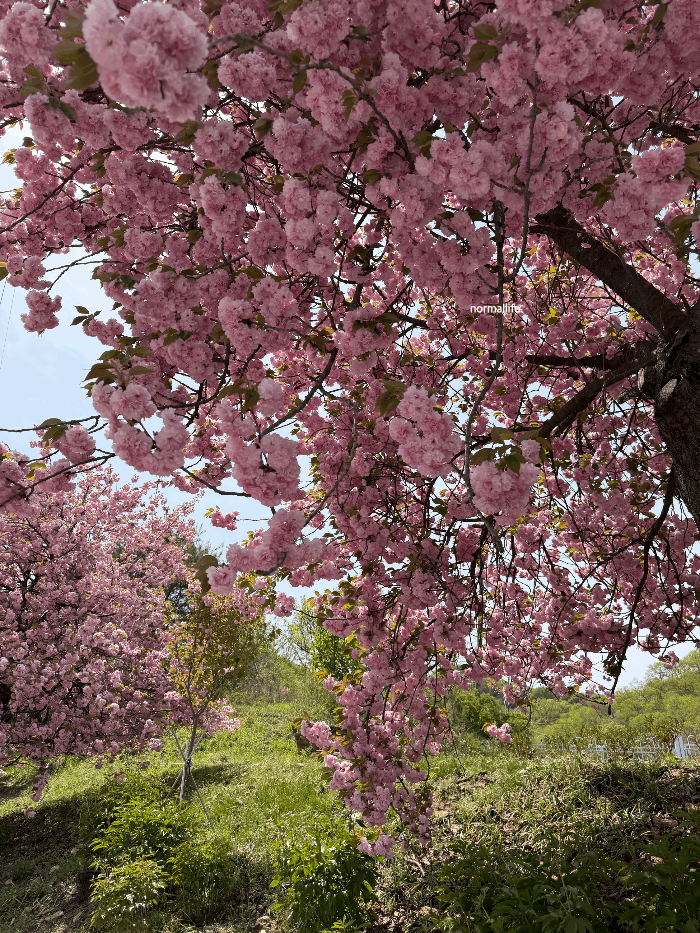 바쁜 일상 속에서 잠시 벗어나 봄바람에 흔들리는 겹벚꽃 향기를 맡으며 힐링하고 싶다면, 영평사만 한 곳이 없을 것 같다. 보통 영평사 겹벚꽃은 일반 벚꽃이 지고 난 뒤인4월 20일경부터 피기 시작해 4월 말까지가장 화려한 모습을 보여준다. 일반 벚꽃보다 꽃송이가 크고 여러 겹으로 피어나 훨씬 화려하고 몽글몽글한 분홍빛 풍경을 볼 수 있다. 대웅전 위쪽 언덕길을 오르면 전국적으로 보기 드문청벚꽃 나무가 있어 , 신비로운 색감의 벚꽃나무를 감상하실 수 있다. 현재 사찰 주변에 철쭉도 함께 피어 있어 봄의 화려함이 정점에 달한 영평사를 서둘러 방문해 보길 추천하고 싶다.