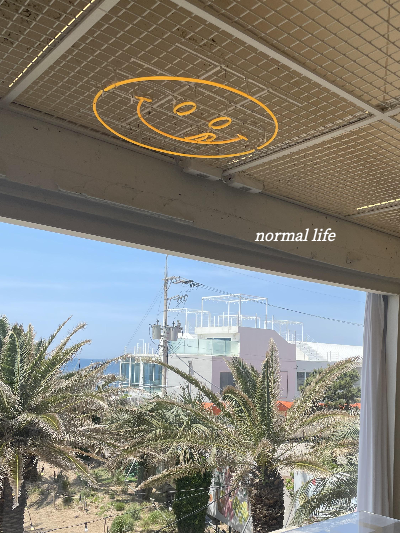 큰 창에 보이는 제주바다와 야자수와 노티드 도넛이면 말 다했다.