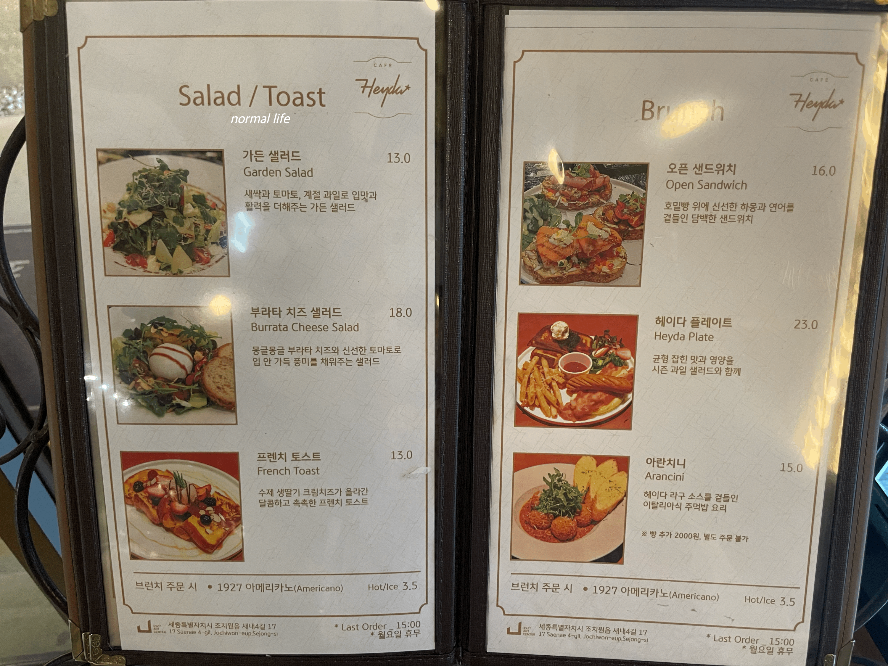 여름과 겨울의 시즌음료, 주류, 어린이 음료와 베이커리류, 브런치, 식사등 다양한 메뉴들이 준비되어 있었다. 브런치는 월요일에는 주문이 불가능하고 월요일이 공휴일인 경우 화요일에 브런치 주문이 불가능하다고 한다. 브런치와 식사메뉴는 15시까지만 주문이 가능하다.