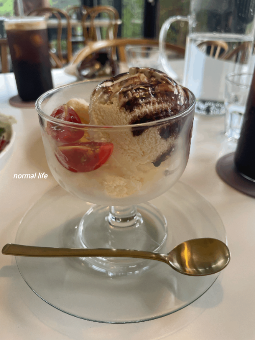 잉글리시 머핀 가운데 해쉬브라운, 베이컨 , 루꼴라, 수란 그리고 그 위에 가득 뿌려진 홀란다이즈 소스가 먹음직스러워 보인다. 신선하고 푸짐한 샐러도도 함께 즐길 수 있다. 3살 딸아이가 좋아하는 #바닐라 아이스크림은 클래식한 아이스크림 볼에 초코시럽과 함께 나왔다. 고즈넉한 한옥카페에서 감각적으로 플레이팅 되어 나오는 브런치를 맛보며 푸르른 자연을 바라보니 이런 게 신선놀임이 아닌가 싶었다.