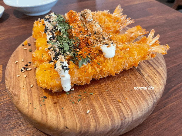 갓 튀겨져 나온 #에비후라이는 통통한 새우살과 바삭함을 맛볼 수 있는 #일본식 새우튀김요리이다. 가지런한 에비후라이 위로 뿌려진 소스와 향신료가 튀김의 감칠맛을 더하고 애피타이저로 손색이 없었다.