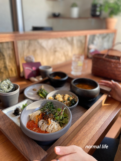한상으로 개인에게 나오는 음식들. 계절마다 조금씩 다르다고 한다. 김치새싹 막국수와 솥밥, 나물, 된장국, 김, 소스가 깔끔하게 개인상으로 나온다. 모든 음식들이 간이 세지 않게 적당하게 어울리며 맛있었다. 플레이팅이 예쁘니 먼저 눈으로 한번 보고 친절하신 사장님의 음식 스토리를 들으며 코스요리를 시작한다.