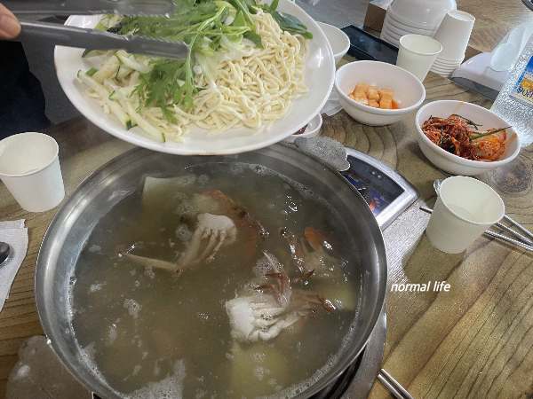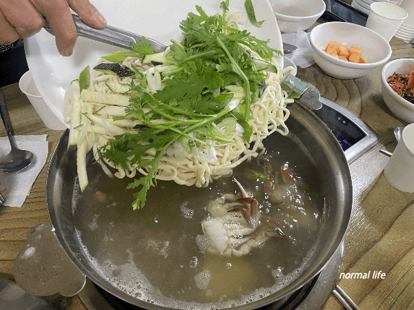 신선한 꽃게와 미더덕, 바지락이 들어간 깊고 시원한 바다맛을 전하는 해물육수가 일품이다. 매일아침 신선한 해산물을 5시간 넘게 달여 당일 사용의 원칙을 지키고 있다고 한다. 큼직한 꽂게와 통통하고 오도독거리는 미더덕과 신선한 바지락을 골라먹는 재미가 쏠쏠하다. 육수는 리필이 가능하므로 칼국수를 먹고 공깃밥을 추가를 시원한 해물육수에 밥과 함께 맛보는 것을 추천한다.
