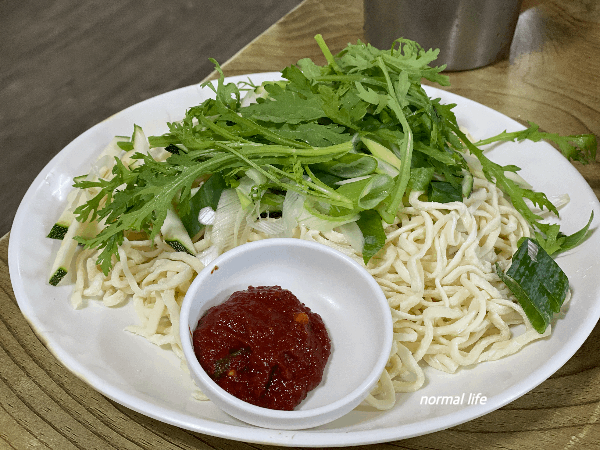 매장에서 매일 반죽해서 만든 수제면과 신선한 쑥갓과 파, 채 썬 호박이 면 사리와 함께 나온다. 아이와 함께 먹고 싶어 사장님께 매운 양념은 따로 부탁드렸다.