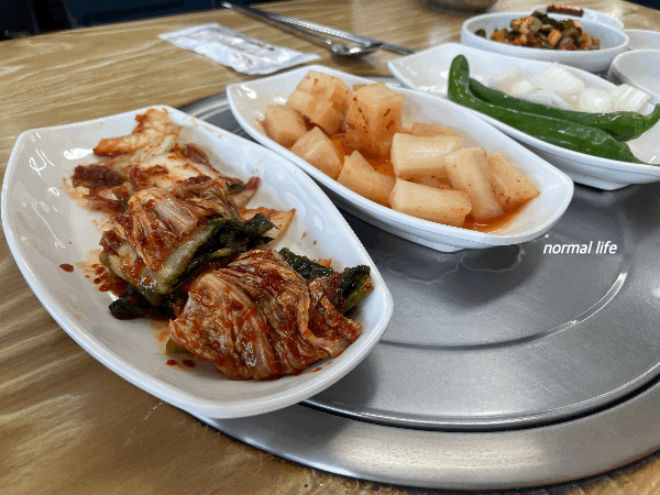 알맞게 익은 배추김치와 국밥과 먹기 좋은 시원하고 아삭한 깍두기, 그리고 신선한 고추와 양파가 밑반찬으로 나온다. 정갈하고 군더더기 없는 깔끔한 밑반찬이었다.