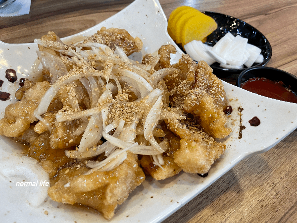 #케챺베이스의 토마토소스가 아닌 새콤달콤한 소스가 바삭한 고기튀김에 한번 볶아져 나온 중국식 탕수육이다. 탕수육이라기보다는 꿔바로우에 가까운 비주얼과 넓적한 고기튀김의 모습이다. 얇게 채 썬 양파는 아삭한 식감과 느끼함을 잡아주고 탕수육 위에 뿌려진 깨소금은 고소한 향을 더한다. #부먹과 #찍먹을 고민할 필요 없는 매력적인 중앙타운의 탕수육이다.
