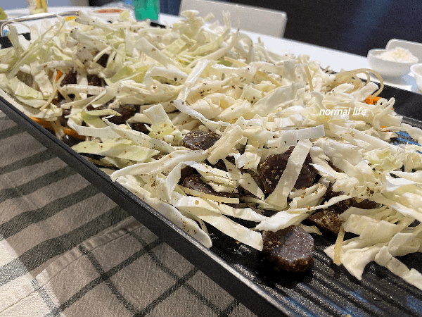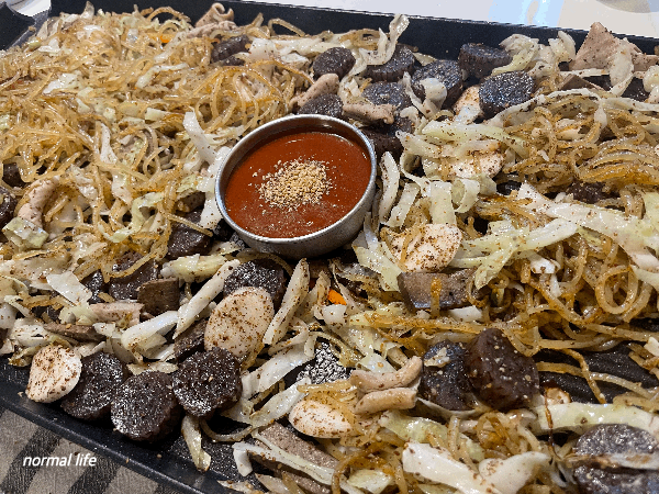 신림동 순대타운의 특유의 분위기를 내고 싶어 넓은 불판 위에 기름 넉넉히 두르고 순대, 간, 곱창, 당근, 양배추, 떡, 쫄면과 들깻가루를 볶아주었다. 야채가 어느 정도 숨이 죽고 쫄면과 떡이 익으면 그때부터 고소하면서도 감칠맛 나는 백순대를 즐기면 된다. 처음 백순대를 접했을 때는 너무도 담백한 맛에 당황할 수도 있지만 먹으면 먹을수록 담백한 백순대의 묘한 중독성에 빠져들게 된다.