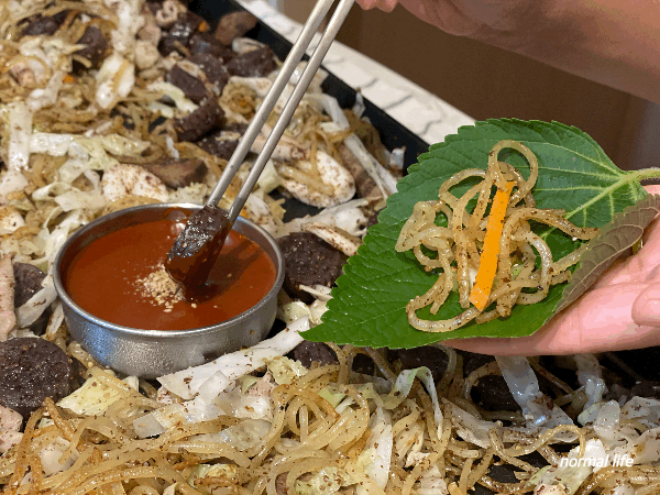 양념장을 사용하지는 않았지만 들깻가루와 조미유만으로도 고소하고 감칠맛 나는 백순대. 담백하고 고소한 맛이 특징인 백순대를 조금 더 맛있게는 방법이라면 향긋한 깻잎 한 장에 잘 볶아진 쫄면과 야채, 그리고 순대를 들깻가루와 마늘이 들어간 비법소스에 콕 찍어 싸 먹으면 또 다른 맛의 백순대를 즐길 수 있다.