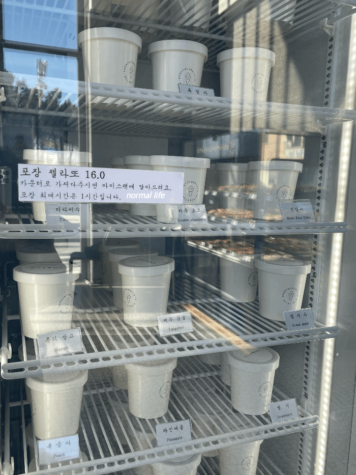 1층 매장 한편에는 포장 젤라또가 준비되어있어 아쉬운 마음을 달랠 수 있다. 순두부젤라또 2호점에서는 16,000원에 젤라또 전메뉴를 파인트 용기에 포장이 가능하다고한다.