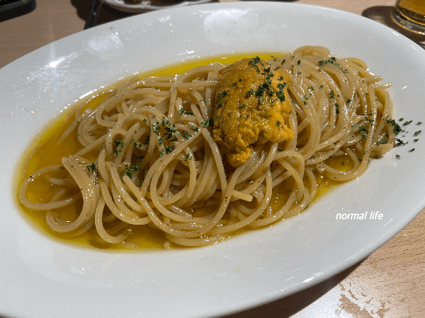 큼직한 성게 한 마리가 통째로 올라간 호호식당의 우니오일파스타. 신선도 관리를 위해 당일 소진할 최고급 우니만 타이트하게 주문하기 때문에 재료가 소진되면 일찍 품절되는 경우가 많다고 한다. 개인적으로 고소하면서도 바다향 가득한 성게알을 좋아하는데 우니오일파스타는 처음 맛보는 성게알 요리이었다. 눅진하면서 달큰한 성게알과 촉촉한 오일의 조화가 너무도 훌륭한 매력적인 파스타였다. 우니오일파스타를 더욱 맛있게 즐길 수 있도록 직원분이 테이블에서 직접 우니와 오일파스타를 버무려주신다.
