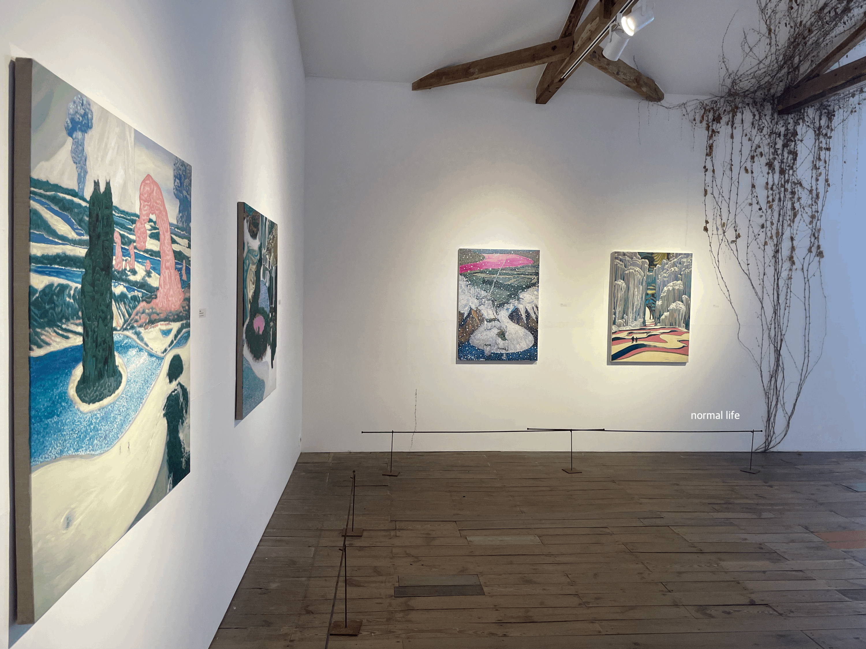 #홍일화 작가의 #임시풍경은 곶자왈 직전의 작업으로 자연과 인간의 평화로운 관계가 유지되는 이상적인 풍경이다. 두드러지는 분홍색은 자연에서 찾아보기 힘든 인공적인 색으로 이들 풍경이 실제와 유사하지만 환상적인 세계임을 보여준다.