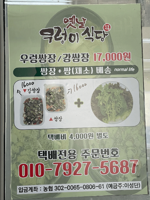당진의 명물인 우렁이쌈밥을 택배와 포장도 가능하다고 하니 당진을 방문하지 않고도 집에서 편하게 맛볼 수 있다. 우렁이강쌈장 17,000원 우렁이쌈장 17,000원을 신선한 쌈채소와 함께 배송가능하다고 한다. 택배비 4,000원은 별도이다.