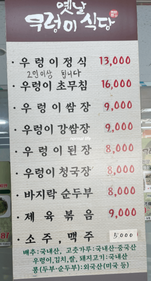 2. 옛날우렁이식당 3호점 메뉴와 가격
