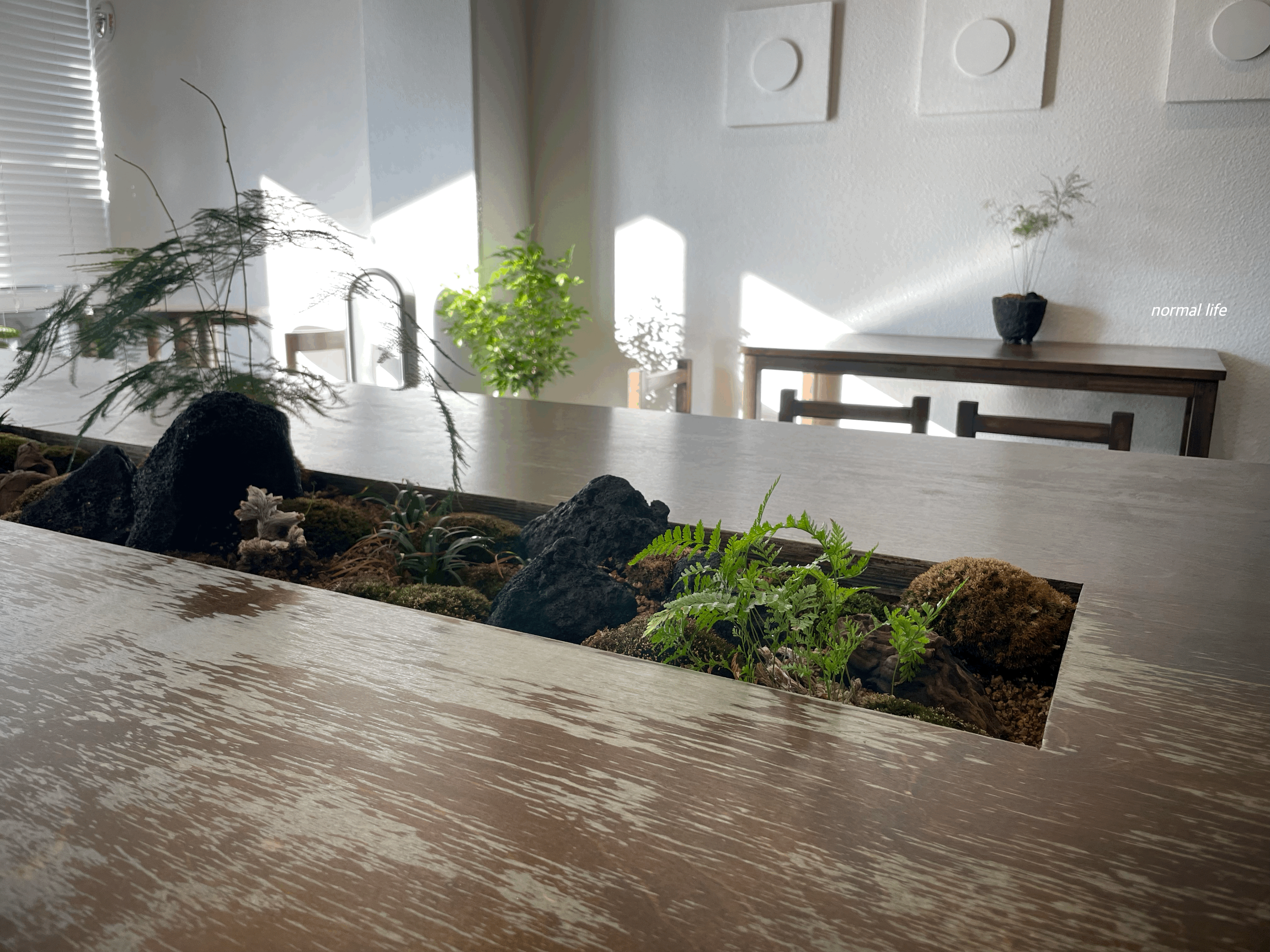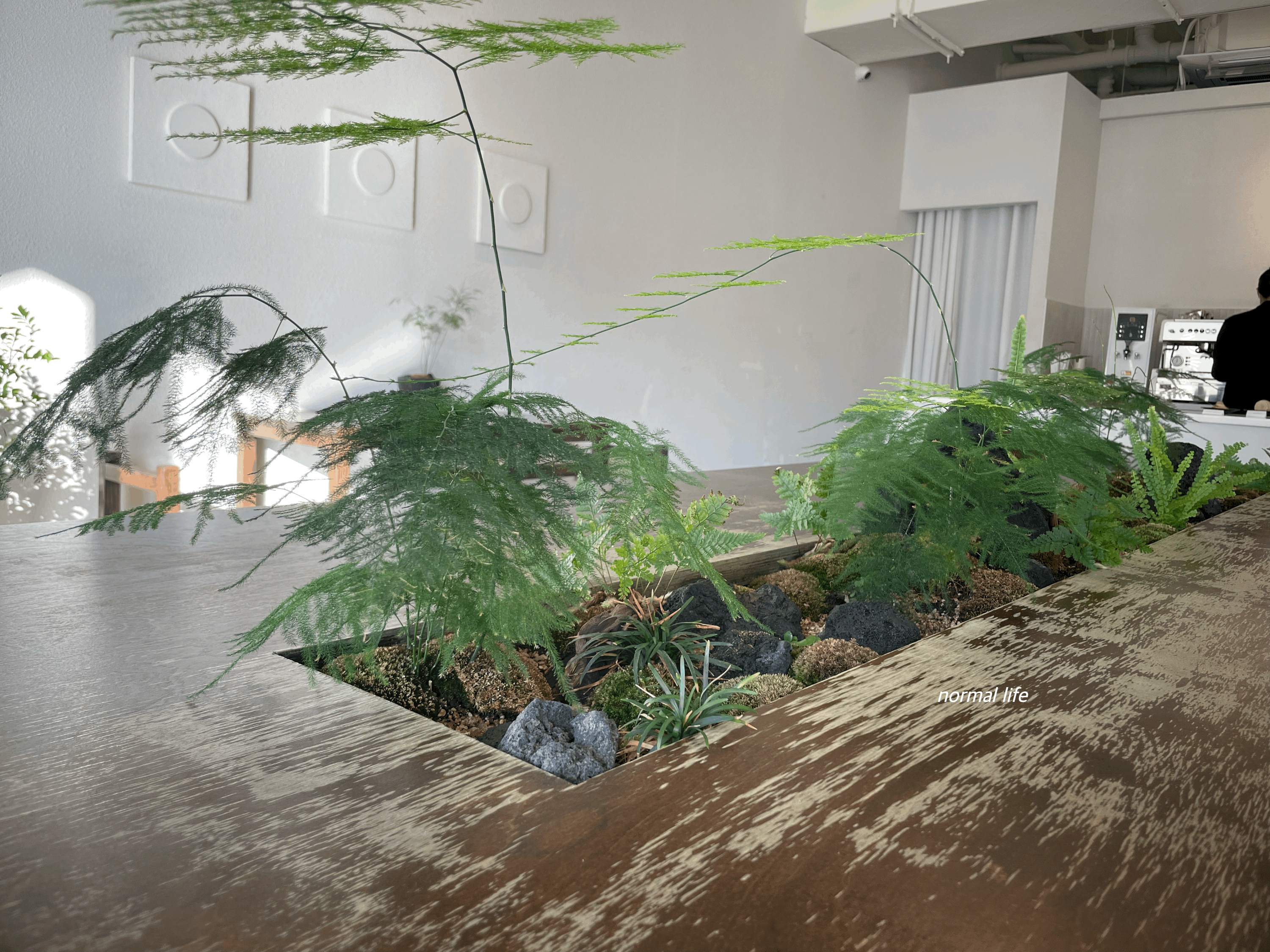 메조네뜨의 공간은 크지는 않지만 군더더기 없는 심플하고 감각적인 사장님의 안목을 느낄 수 있었다. 깔끔한 화이트톤과 우드 테이블이 사이로 들어오는 햇살이 조화를 이뤄 아늑하고 편안한 분위기를 자아냈다. 매장 중앙 큰 우드테이블 중앙에는 정확 지는 않지만 아스파라거스 나누스와 다양한 식물 그리고 화산석으로 꾸며서 싱그러운 느낌과 자연이 주는 편안함을 함께 경험할 수 있는 공간이었다.