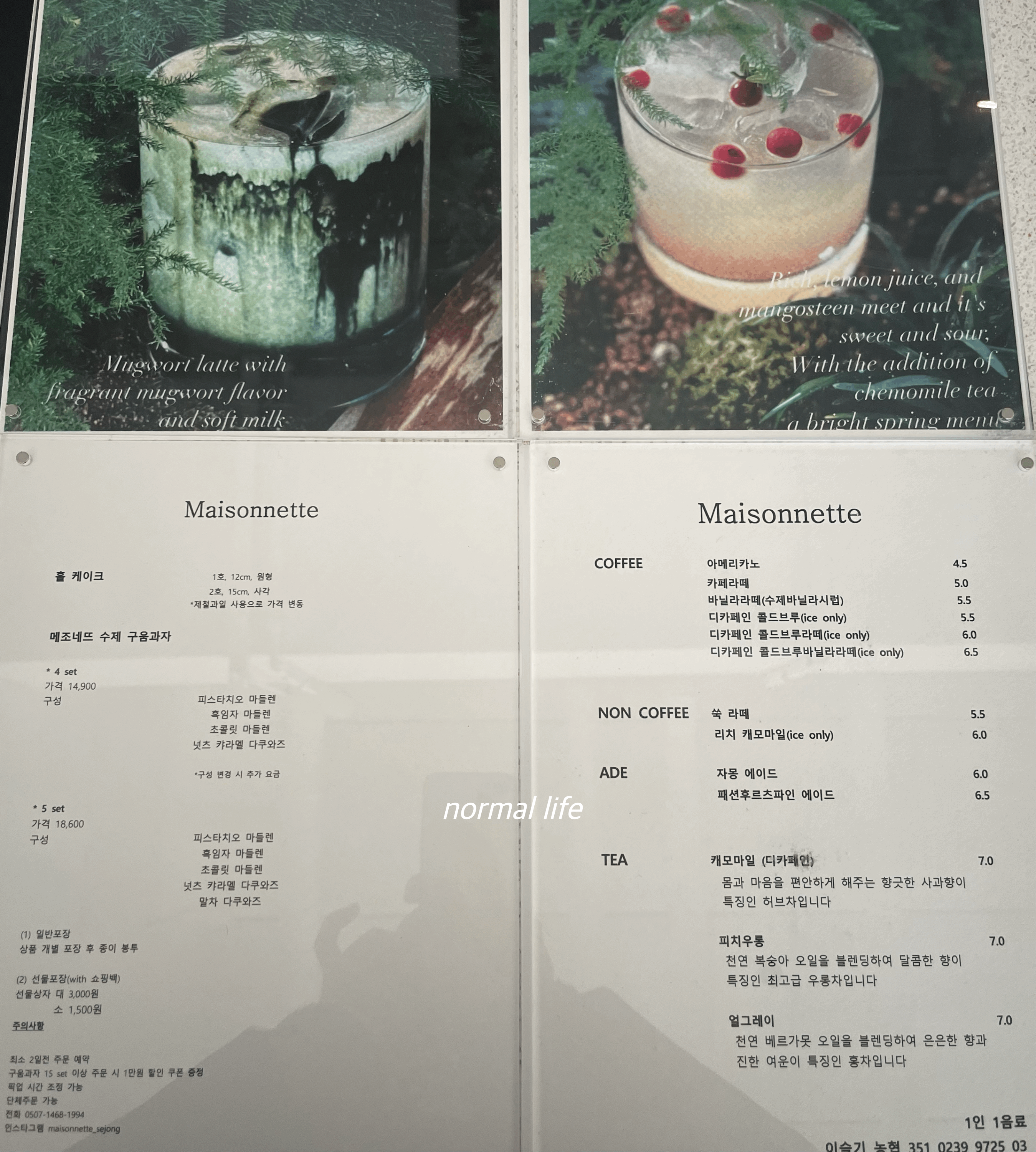 리치의 상큼 달콤함과 캐모마일의 꽃향기를 함께 느낄 수 있는 메조네뜨의 시그니처 #리치 캐모마일 6,000원, 향긋한 쑥의 풍미와 부드러운 우유가 함께 어우러진 또 다른 시그니터 #쑥라떼 5,500원, 아메리카노 4,500원, 카페라떼 5,000원이다. 메조네뜨는 1인 디저트샵으로 한정수량만 가능해 인스타그램이나 전화로 홀케이크는 미리 예약 주문을 하면 편한 시간대에 픽업이 가능하다.