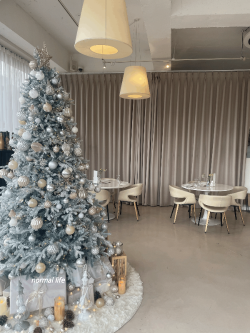 내가 방문했던 2023년 11월은 크리스마스 시즌과 연말을 맞이해 포근하고 사랑스러운 분위기로 가득한 드로이였다. 세련된 실버와 화이트톤의 크리스마스트리와 화이트 테이블마다 놓여있는 생화가 분위기를 더했다. 무드 있는 분위기의 드로이는 특별한 날 소중한 사람들과 즐거운 식사하기에 딱 좋은 곳이었다.