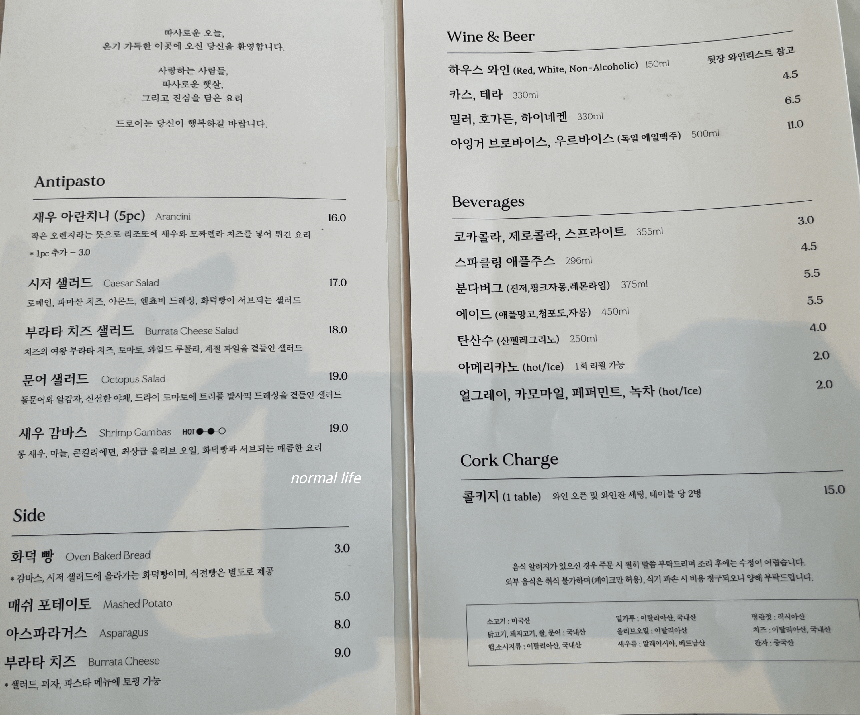 드로이는 노키즈존으로 11세이상만 식사가 가능하다. 아이와 함께 할 수 없는 공간이라 아이엄마로서 조금은 아쉽지만, 오히려 무드 있는 드로이에서 차분하게 오롯이 이탈리안 음식을 맛볼 수 있어 좋았다.
