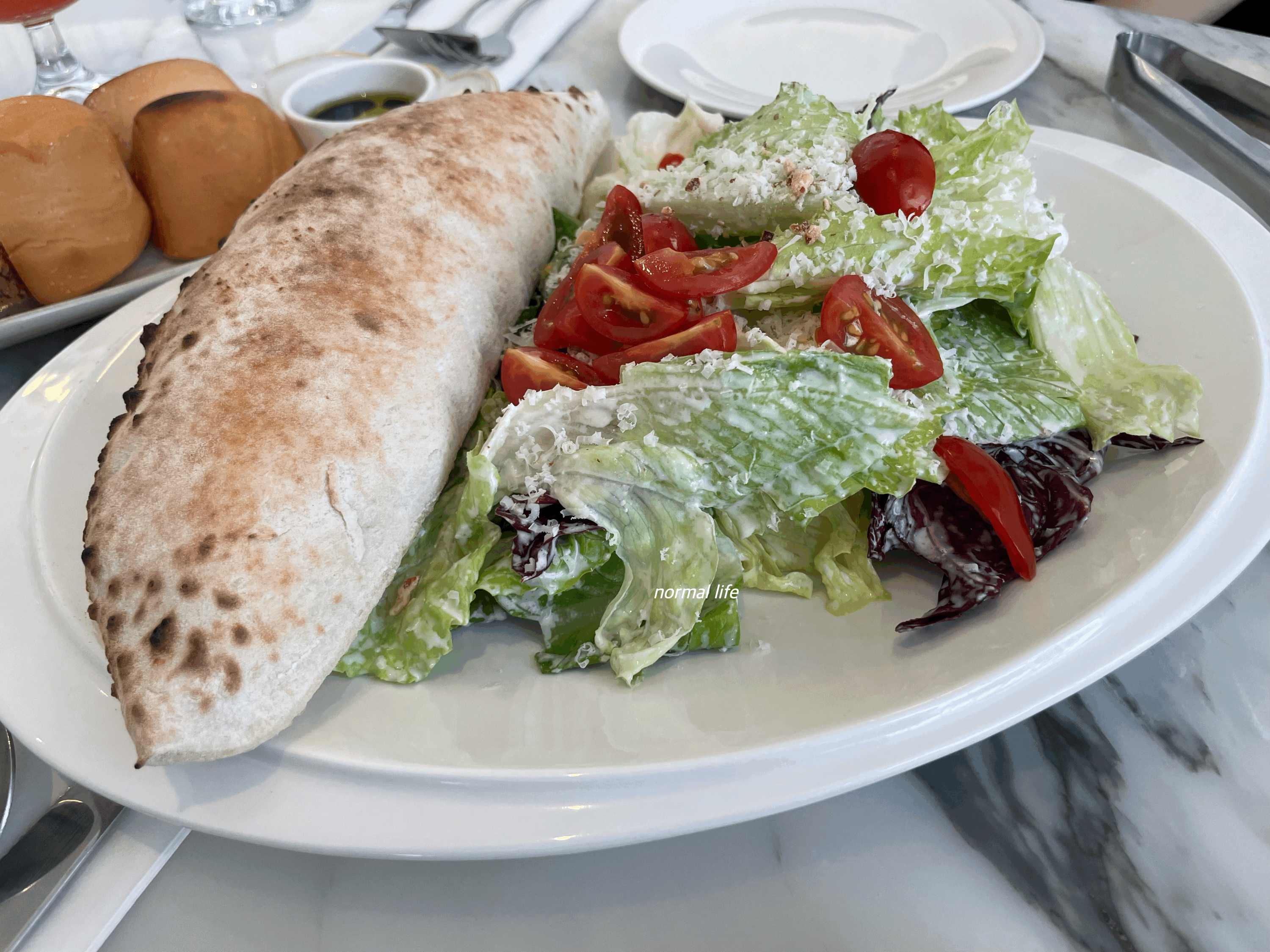 엔초비 드레싱에 버무려져 나온 로메인 위에 하얀 파마산치즈와 신선한 토마토가 곁들여진 #시저샐러드이다. 드로이는 조금 특별하게 갓 구운 #화덕빵과 함께 맛볼 수 있다.