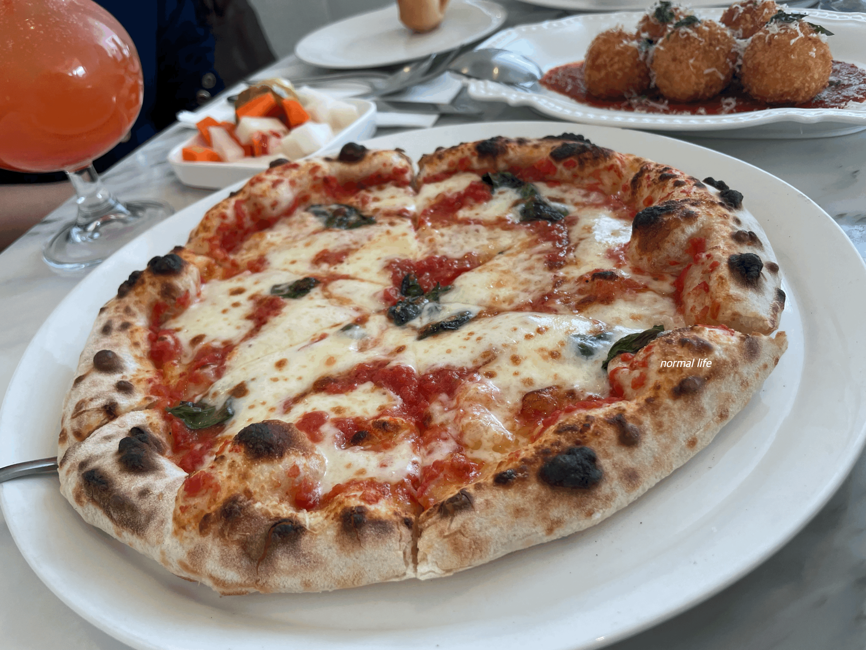 직접 반죽한 도우와 토마토 소스, 생 모짜렐라 치즈 위에 신선한 바질이 올라간 기본에 충실한 나폴리식 화덕피자의 #마르게리따피자이다.