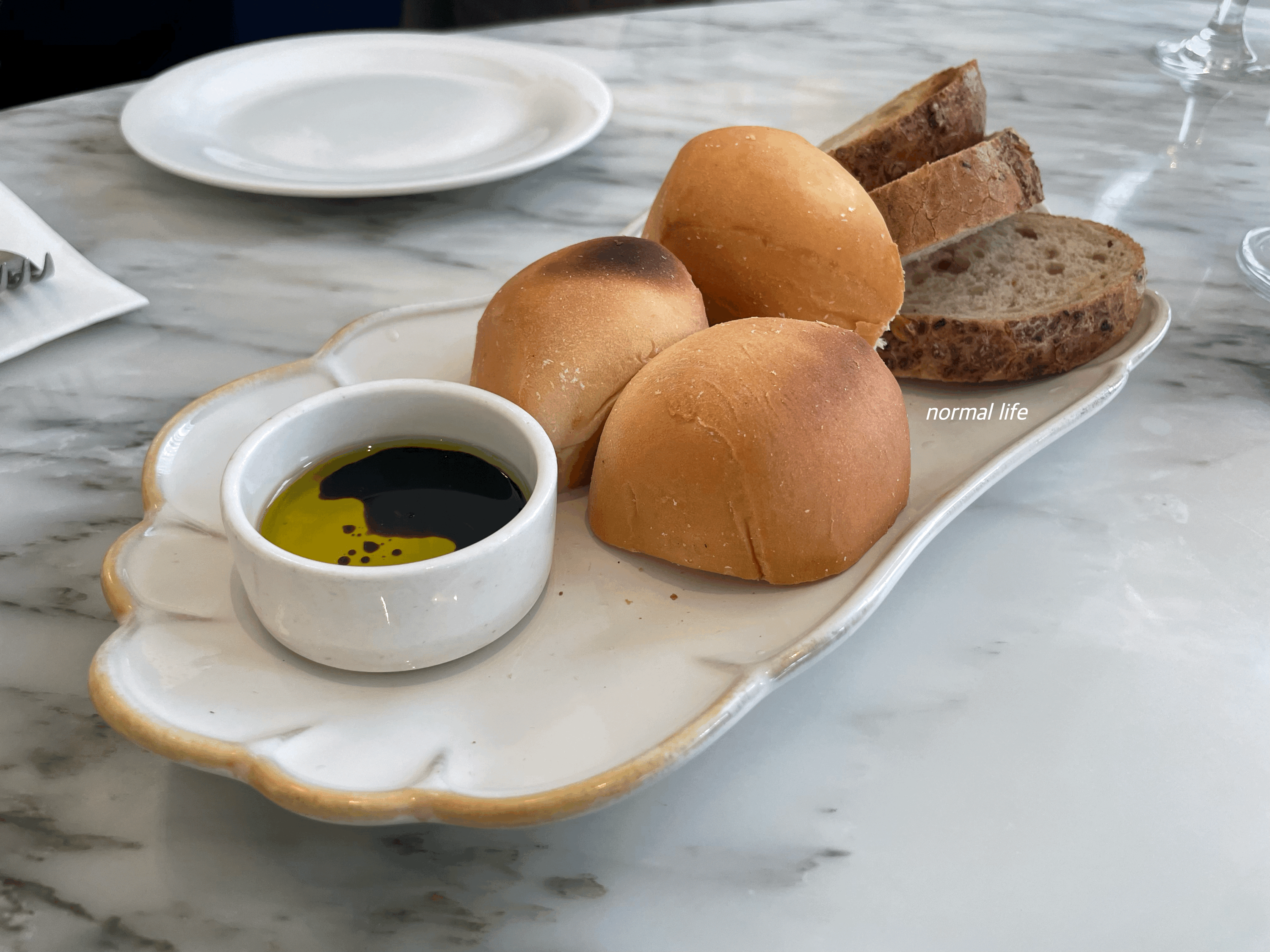 두종료의 빵과 올리브오일과 발사믹 식초가 함께 나와 따끈따끈한 #식전빵을 맛볼 수 있다.