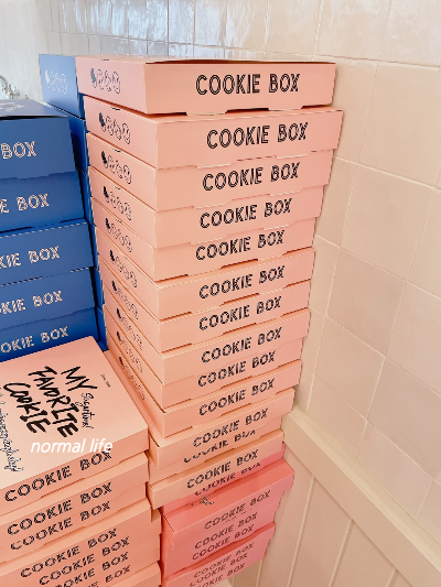 쿠키 상자와 종이가방이 이렇게도 예쁠일인가. 포장 전문점이라 그런지 사장님이 많이 신경 쓰신 것 같았다. 너무도 예쁜 파스텔 색감과 귀여운 폰트의 상자와 종이가방. 상자 포장은 4개는 천 원, 8개부터는 무료이다. 종이봉투는 무료로 포장해 주시고 비닐봉지는 환경부담금 백 원이다. 너무도 예뻐 들고 다니기에도 기분 좋은 종이가방은 삼백 원이다.
