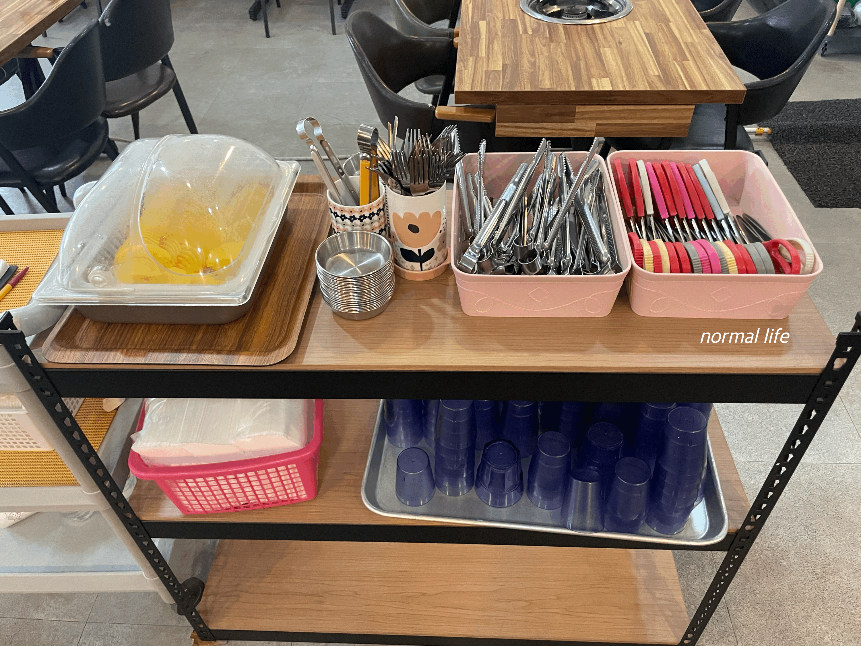 유성즉석떡볶이 매장 중앙에 셀프존이 있는데 단무지와 집게, 가위, 포크 등이 비치되어 있어 편리하게 이용할 수 있다.