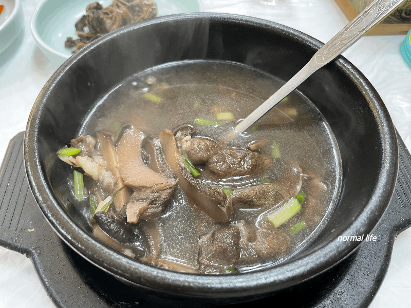 나는 대둔산을 방문하면 주로 더덕정식을 많이 맛보았었는데 이번 대둔산식당을 방문으로 #능이해장국이라는 버섯요리를 처음 맛보았다. 능이버섯에서 우러난 진한 육수색과 버섯 특유의 향이 좋았고 인위적인 맛이 아닌 자연산 능이에서 나오는 감칠맛이 담백하면서도 매력 있었다. 대둔산식당을 방문하는 80% 이상이 이 능이해장국을 맛보기 위해 방문한다고 한다. 처음 접하는 음식이었지만 대둔산식당의 능이해장국에 매료되었다.