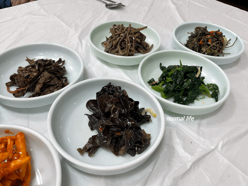 우리는 능이해장국 6개를 전화로 예약하고 방문하여 건취나물, 건가지, 고사리, 목이버섯, 새송이버섯, 더덕무침 등 건강한 밑반찬이 우리 자리에 맛깔스럽게 준비되어 있었다. 각기 다른 독특한 향과 고유의 맛을 가지고 있는 산채류를 맛보니 대둔산의 공기와 함께 건강해지는 느낌이었다.