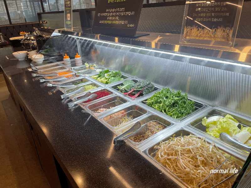 #저칼로리 #고단백질 식사를 할 수 있는 소담촌은 신선한 각종 야채 샤브샤브 재료들이 리필코너에 준비되어 있어 맛보고 싶은 만큼 리필을 하면서 풍족한 식사를 할 수 있다. 배추, 숙주, 치커리, 청경채, 새싹채소, 비트, 오이, 깻잎, 당근, 양배추, 크래미, 버섯, 유부, 호박, 만두, 수제비, 떡, 면, 라이스페이퍼, 파인애플, 김치, 피클 등이 리필코너에 정갈하게 준비되어 있어 마음껏 이용할 수 있다.