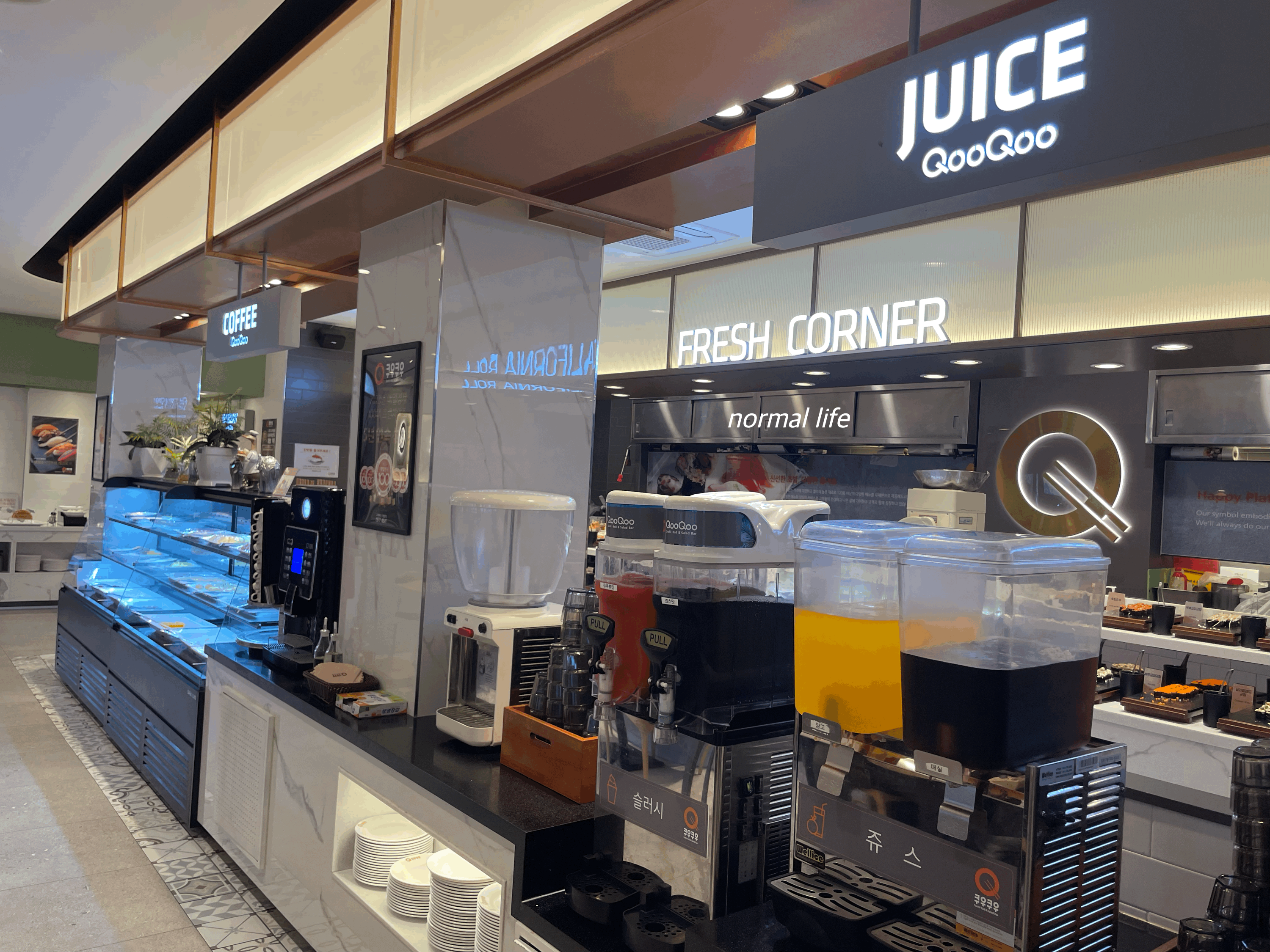 주스와 탄산, 슬러시를 맛볼 수 있는 음료코너와 식후 따뜻한 허브티와 커피를 마실 수 있는 쿠우쿠우이다.