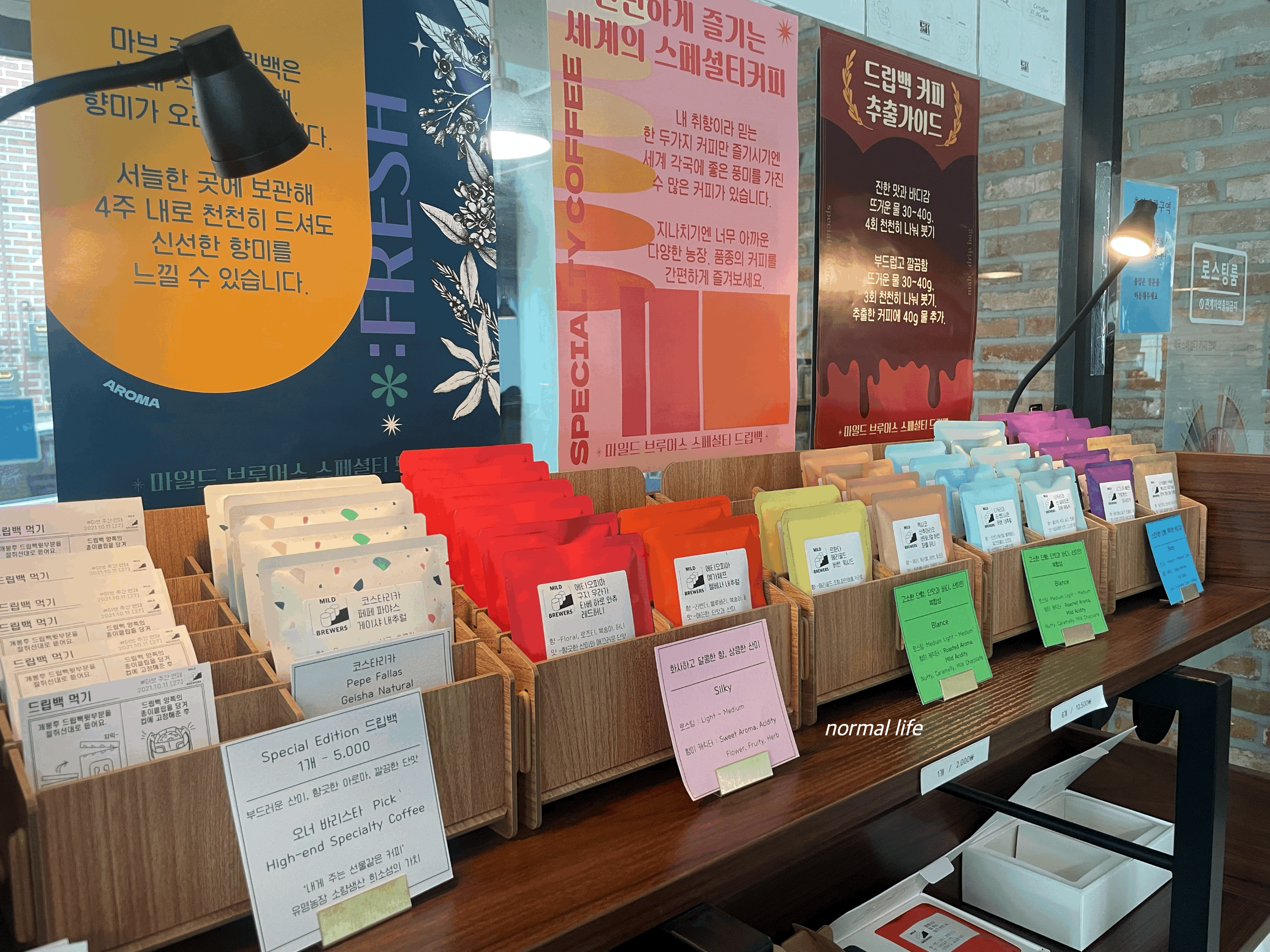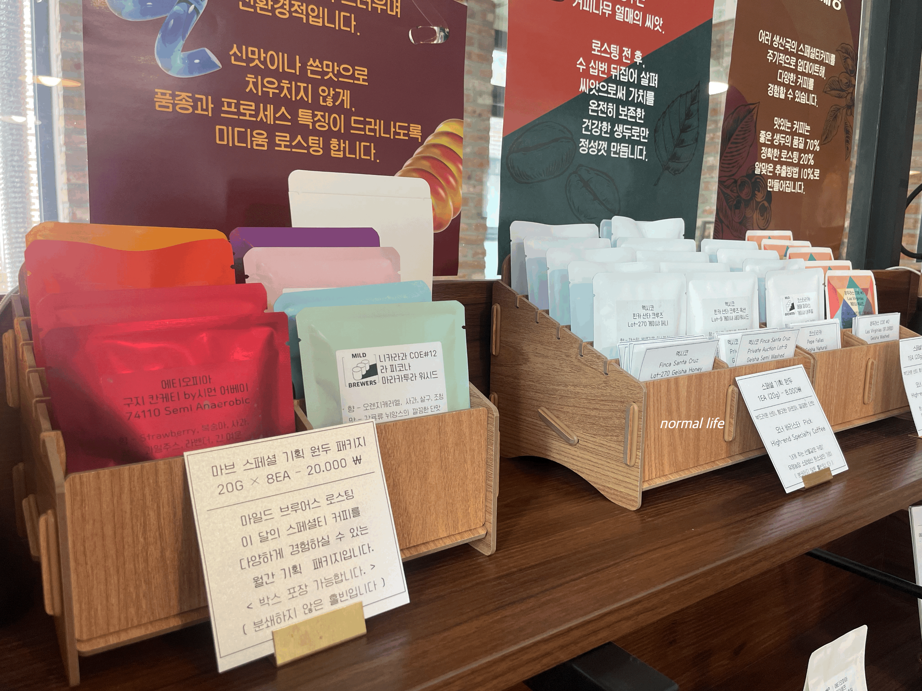 마일드 브루어스 매장 한편 로스터리 하는 공간과 다양한 드립백이 눈에 띈다. 드립백은 매장에서 로스터리부터 포장까지 직접 하고 있다고 한고 원두와 드립백은 구입 후 서늘한 곳에서 보관 후 4주 내에 소비하는 것을 권장한다고 한다. 다양한 품종의 원두 8가지를 맛볼 수 있는 #마브 스페셜 기획 원두패키지는 홀빈으로 마일드 브루어스의 월간 기획 라인업을 경험할 수 있는 패키지라고 한다. 매장에 진열된 다양한 드립백 속에는 하이엔드 드립백이 숨어있으니 천천히 구경하는 재미도 쏠쏠했다. 다양하고 컬러풀한 드립백과 콜드블루원액은 선물용으로도 손색없어 보였다.