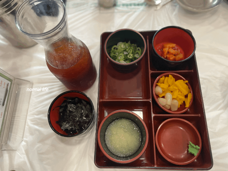 여름철 별미인 메밀소바이지만 대정칼국수의 자루소바는 어느 계절이든 인기인듯하다. 매장에서 직접 제면한 탱글한 메밀면 두 덩어리와 보틀로 나오는 진하고 달달한 육수. 육수가 모자라 보이면 사장님과 직원분들께서 리필해 주시니 넉넉히 맛볼 수 있다. 자루소바의 맛을 더해줄 김가루, 파, 무, 와사비 등이 따로 제공되어 취향껏 자루소바를 즐 길 수 있다. 여사장님께서 자루소바 맛있게 먹을 수 있는 방법을 알려주셨는데 자루소바를 맛보며 중간중간 육수에 새 육수를 더해 진한 육수맛을 유지하면서 먹으면 더 맛있다고 알려 주셨다.