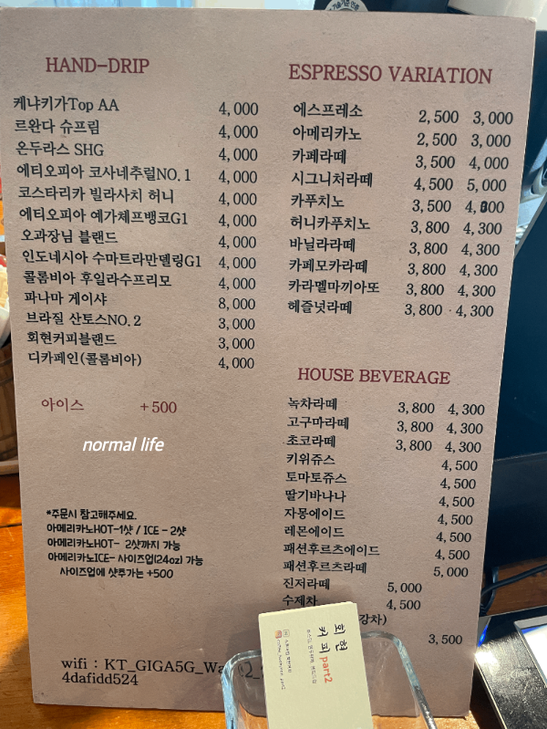 게이샤의 최상급인 #파나마게이샤 드립을 단돈 8,000원에 마실 수 있는 회현커피part2이다. 핸드드립커피는 4,000원으로 매우 합리적인 가격으로 진하고 다채로운 맛이 느껴지는 맛있는 커피를 맛볼 수 있다. 질좋은 핸드드립커피를 3,000원 4,000원 8,000원으로 맛본다는게 너무 신기하고 의심스러웠지만 갓 내려진 진하고 풍부한 향 가득한 드립커피 한잔을 세월이 깃든 회현커피part2의 공간에서 마시니 더욱 특별한 느낌이었다.