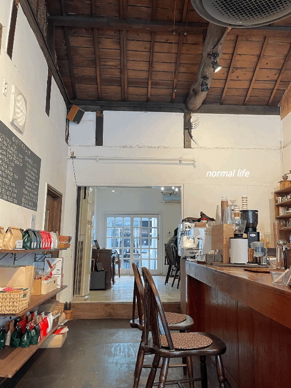 세월의 흔적이 느껴지는 서까래가 눈길이 가는 회현커피part2의 내부이다. 매장이 크지는 않지만 세월의 흔적이 고스란히 잘 보존되어 있어 시간이 천천히 흘러가는 군산과 잘 어울리는 특별한 공간의 회현커피part2였다. 카페 입구에 6인이 앉을 수 있는 테이블과 드립커피를 내리는 모습을 보면서 커피를 마실 수 있는 바 테이블과 카페 안쪽에 3개 정도의 테이블이 준비되어 있다. 카페 너머로는 로스팅하는 공간도 따로 있다.