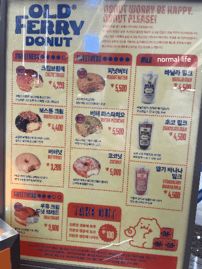 처음 접하는 매장이기에 일단 메뉴판에 베스트부터 찾았다. 이곳의 대표메뉴는 크림브뤨레, 피넛버터, 버터 피스타치오, 우유크림도넛 브래드이다. 우유크림도넛은 노티드 도넛에서도 맛보았기에 내가 고른 크림브륄레와 딸이 고른 버터넛을 사이좋게 하나씩 구입하였다. 이곳의 시그니처 드링크인 밀크도 함께 구입하고 싶었지만 4살 딸아이와 함께였기에 고민할 시간도 없이 급하게 도넛만 구입하고 얼른 빠져나왔다. 매장에 너무도 친절하게 모형 도넛이 아닌 실물 도넛이 진열되어 있어 메뉴판 고민이 아닌 실물을 보고 맛있어 보이는 도넛을 구입할 수 있어 좋았다. 많이 접했던 던킨 도넛이나 크리스피 도넛보다는 가격이 있지만 던킨과 크리스피는 하나로는 뭔가 부족했었는데 올드페리 도넛은 통통하고 큼직해서 하나만 먹어도 충분했다.