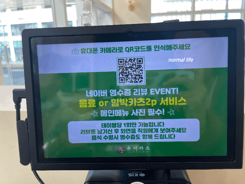 유미카츠 세종다정점은 네이버 영수증 리뷰를 진행 중이다. 테이블오더로 주문 후 네이버에 메인메뉴 사진과 방문 후기를 남기고 사장님께 리뷰를 보여드리면 음료, 함박카츠 2P 두 가지 중 한 가지를 서비스로 제공하고 있다. 나도 네이버 방문 리뷰를 남기고 함박카츠를 제공받았는데 서비스라기에는 메인메뉴같이 푸짐한 함박카프 양에 놀랐다.