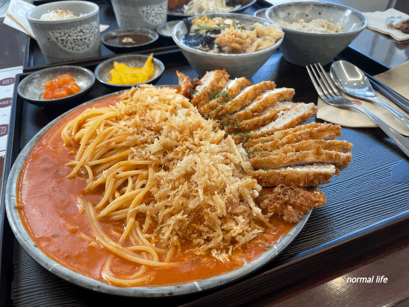 깍두기, 단무지, 샐러드, 장국과 메인메뉴가 한상차림으로 깔끔하게 나오는 유미카츠이다. 로제파스타와 돈까스가 만난 #로제파스타카츠를 주문하여 좋아하는 메뉴인 스파게티와 돈까스를 동시에 즐길 수 있어 만족스러운 메뉴였다. 바삭한 돈까스가 먹기 좋은 크기로 썰어져 나와 촉촉한 로제소스에 꼭 찍어 맛을 보니 이색적인 이면서 가성비 훌륭한 로제파스타카츠이다. 엄마아빠가 좋아하는 스파게티와 아이가 좋아하는 돈까스의 조합의 로제파스타카츠는 아이와 함께 외식하기 할 때 선택하면 너무도 좋은 메뉴이다.