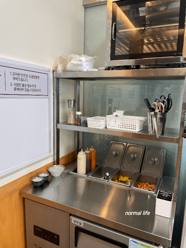 다정센타프라자 1층에 위치한 유미카츠는 복층구조로 1층은 4 테이블 2층은 5 테이블로 이루어져 넓은 식당 내부이다. 각층마다 양배추와 밑반찬 소스를 직접 가져다 맛볼 수 있는 셀프바가 준비되어 있고 2층에는 주방과 음료냉장고가 준비되어 있다.