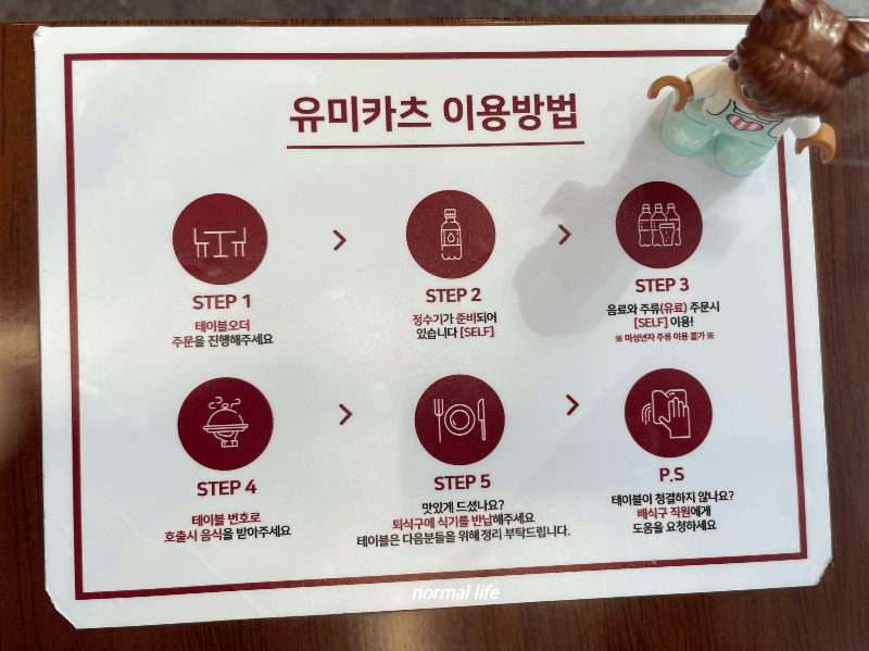 한상차림으로 깍두기, 단무지, 양배추, 장국이 돈까스와 정갈하게 나오는 유미카츠이다. 모자란 반찬과 소스는 필요한 만큼 추가로 이용할 수 있도록 셀프바가 준비되어 있다. 아이와 식사 시 필요한 어린이식기, 집게, 가위, 남은 음식을 포장할 수 있는 포장용기, 머리끈 등 다양한 것들이 준비되어 있고 음료와 주류는 테이블오더로 주문 후 직접 이용하면 된다.
