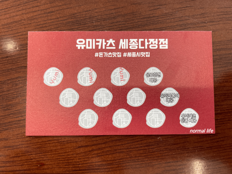 유미카츠 세종다정점은 네이버리뷰 이벤트 외에도 10,000원당 도장 1개를 찍는 쿠폰을 제공하고있다. 쿠폰도장 4개 음료 한캔, 쿠폰도장 8개 유미떡볶이, 쿠폰도장 12개는 유미카츠 단품을 제공한다고 한다고 하니 유미카츠를 자주 방문한다면 쿠폰을 꼭 챙기길 바란다.