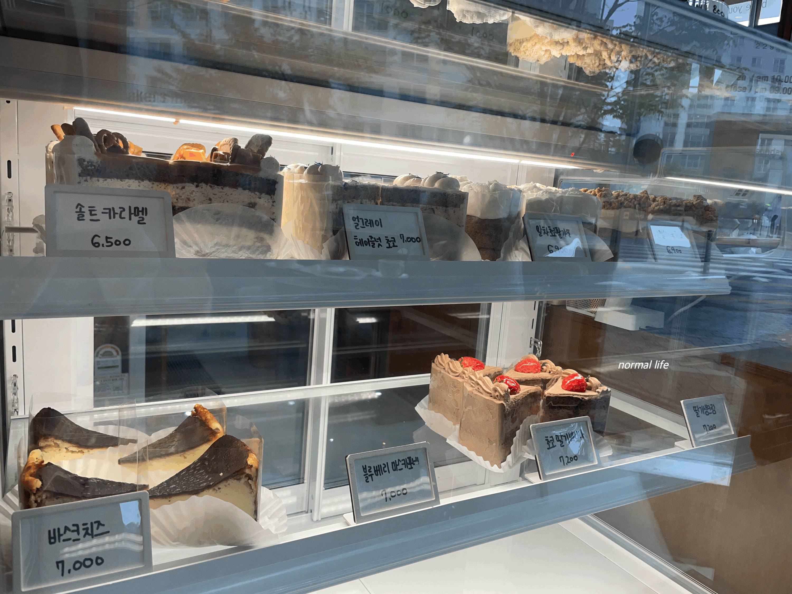 오전 10시 40분쯤 베이크229 2호점을 방문하였는데 다양한 구움 과자와 먹음직스러운 조각케이크들이 쇼케이스에 가득하였다. 베이크299의 시그니처인 #솔트카라멜 6,900원 #얼그레이 헤이즐럿 초코 7,000원 #말차초코팥갸또 6,900원 #바스크치즈 7,000원 #블루베리 마스카포네 7,000원 #초코딸기바나나 7,200원 #딸기생크림 7,200원이며 시즌별로 케이크 라인업은 다르다고 한다.