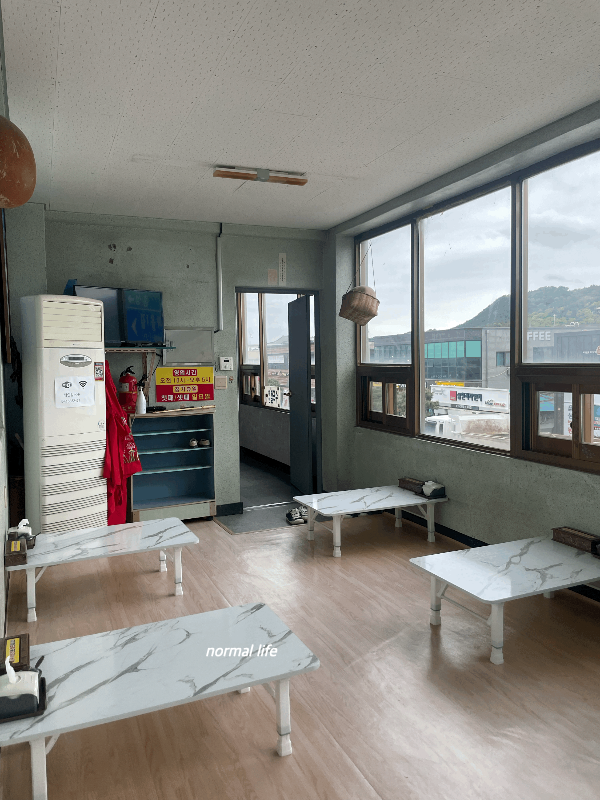 1층과 2층으로 이루어진 해인칼국수는 1층에는 오픈 주방과 입식좌석, 2층에는 마루 좌석으로 되어있었다. 일요일 오후 4시 20분쯤 주방정리 중이신 시간에 방문하였는데도 친절하게 맞아주셨고 아이와 함께 방문하였는데 2층으로 올라가서 편안하게 식사하라며 안내해 주셨다. 2층을 이용할 경우에는 1층에서 주문과 계산을 먼저 한 후 2층으로 올라가면 된다. 오래된 로컬 맛집임에도 불구하고 해인칼국수를 들어섰을 때 바로 보이는 오픈주방이 깨끗하게 잘 관리된 모습이 매우 마음에 들었다.