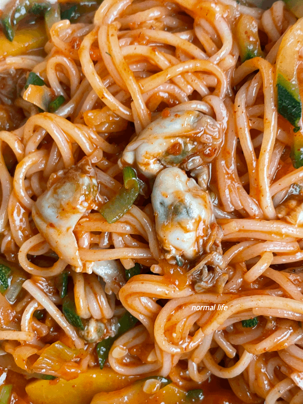 현지인 맛집인 해인칼국수는 #생방송투데이에 #애호박 비빔국수로 화제를 모았다고 한다. 오이, 양파, 상추 등 신선하고 아삭한 야채들이 들어가는 비빔국수와는 다르게 아삭한 식감의 애호박이 들어가는 것이 특징이다. 애호박과 파, 굴, 바지락살이 들어가고 처음 맛보았을 때 비빔국수가 따뜻해서 당황했다. 보통의 비빔국수는 차가워서 시원하게 맛보는데 따뜻한 해인칼국수의 비빔국수는 따뜻한 양념장으로 비빔국수를 만들기 때문에 따뜻하게 나오는 게 특징이라고 한다. 따뜻하지만 쫄깃한 면과 푸짐한 바지락살과 굴 그리고 아삭한 애호박볶음이 매력적인 어디서도 맛보지 못한 비빔국수였기에 해인칼국수를 방문한다면 비빔국수를 꼭 맛보길 추천하고 싶다.