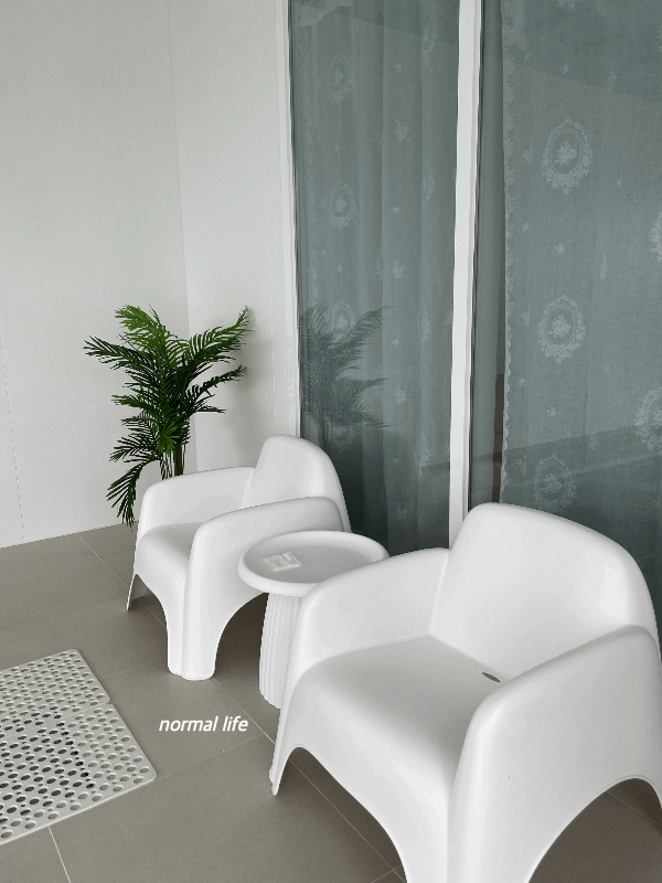 거실과 연결되어 유리온실로 꾸며진 동락풀빌라의 테라스이다. 폴딩도어로 되어있어 어디든 예쁜 동락풀빌라의 마당을 캠핑의자에 앉아 즐길 수 있다. 화이트톤의 캠핑의자와 유럽감성의 파라솔이 너무도 취향저격이었으며 이곳에 앉아 아이가 수영장에서 노는 모습도 지켜볼 수 있고 동락풀빌라에 준비되어 있는 전기그릴로 고기파티도 할 수 있었다.