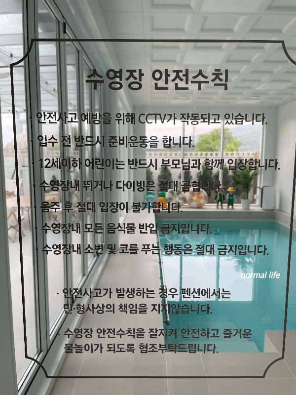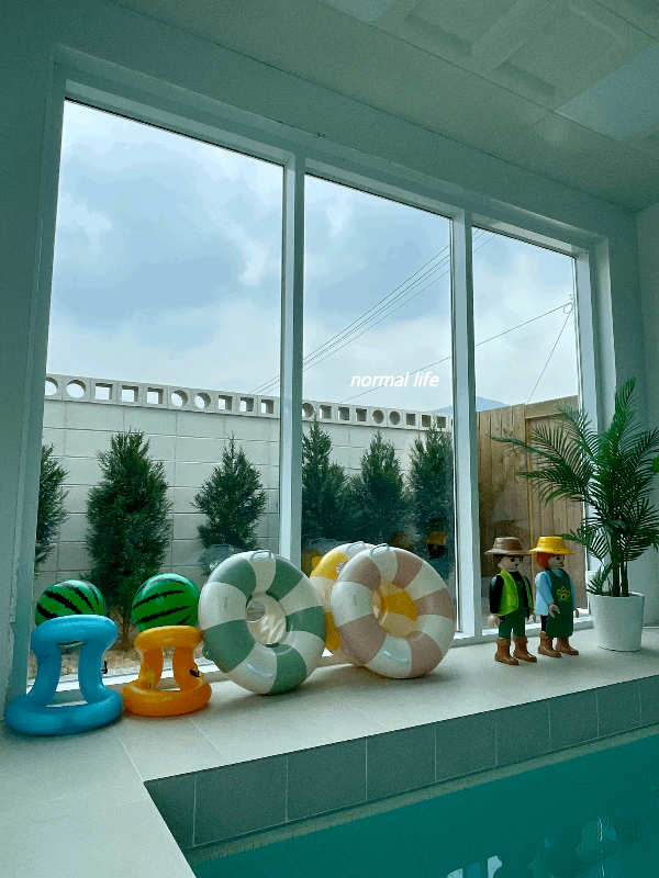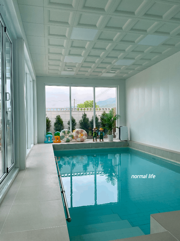 수영장이 있는 풀빌라는 온수풀 이용 시 추가금액이 있는데 동락풀빌라는 24시 미온수 수영을 추가금액 없이 마음껏 즐길 수 있었다. 덕분에 추위와 감기 걱정 없이 어린아이들이 마음껏 물놀이를 즐길 수 있었다. 튜브, 구명조끼, 비치볼이 준비되어 있어 따로 준비하지 않고 동락풀빌라의 튜브를 이용하였다. 제습기가 작동되고 있어 수영장임에도 불구하고 쾌적하게 즐길 수 있었고 깨끗하게 관리된 수영장 덕분에 아이들이 놀기에도 마음이 놓였다. 깨끗하고 감각적인 수영장이 내가 뽑은 동락풀빌라의 최고의 매력포인트이다.