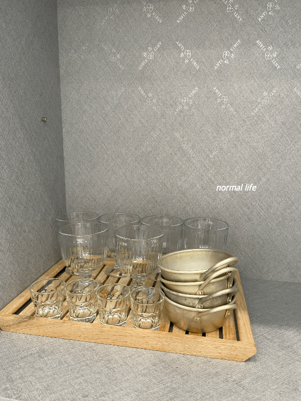 주종별로 와인잔, 소주잔, 막걸리잔이 준비되어 있다.